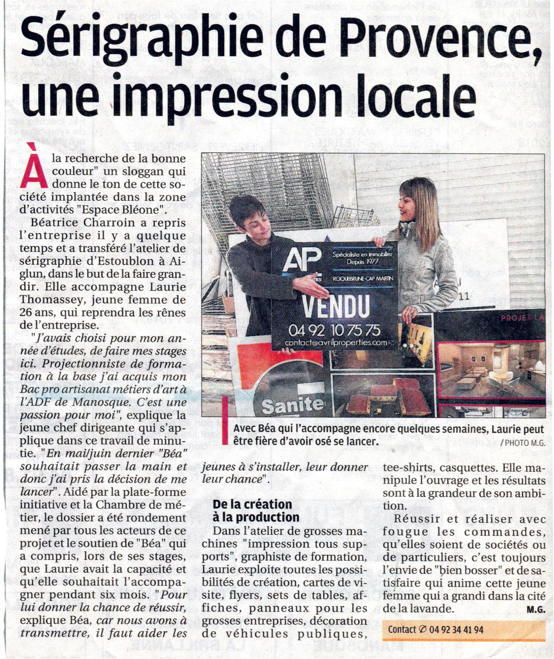 Sérigraphie de Provence, une entreprise basée à Aiglun (04510) dans les Alpes-de-Haute-Provence.